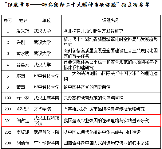 近日湖北省社会科学界联合会公布了深度学习研究阐释党的二十大精神专项课题预立项名单我校马克思主义学院院长阎占定教授主持申报的课题我国建设农业强国的逻辑理路与实践进路研究获批预立项。党的二十大报告中指出全